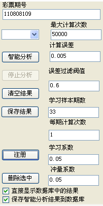 图2预测新号设置,是软件的默认设置,直接点“智能分析”按键就能得到最新彩票要出的红球和蓝球。当然你也可以根据自己对历史的分析,设置相应参数,得到更好的结果。